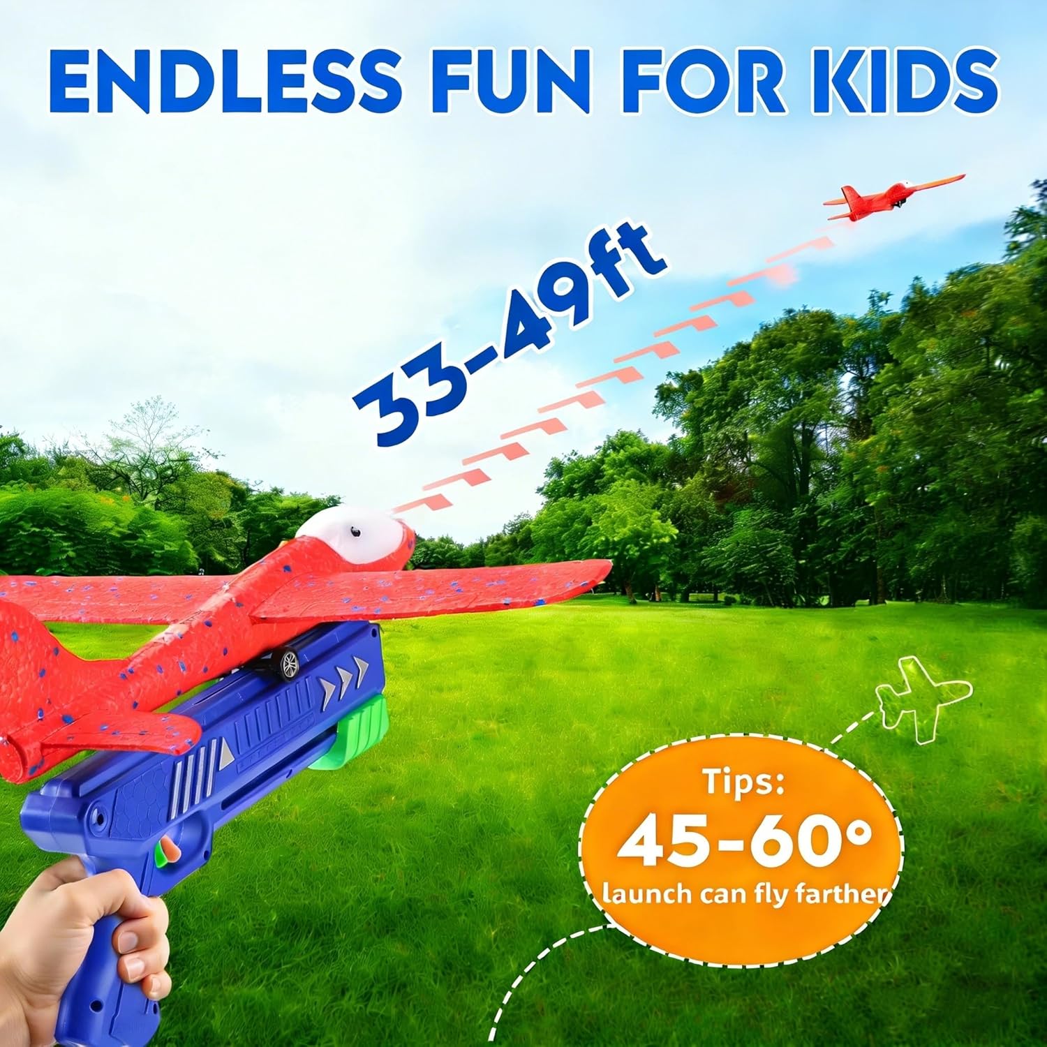 33-49 Ft Distance: As an garden games, the plane toy has an effective range of 49 ft. The children can compete to see whose plane goes the furthest and study the effect of the wind direction and angle on flight distance.