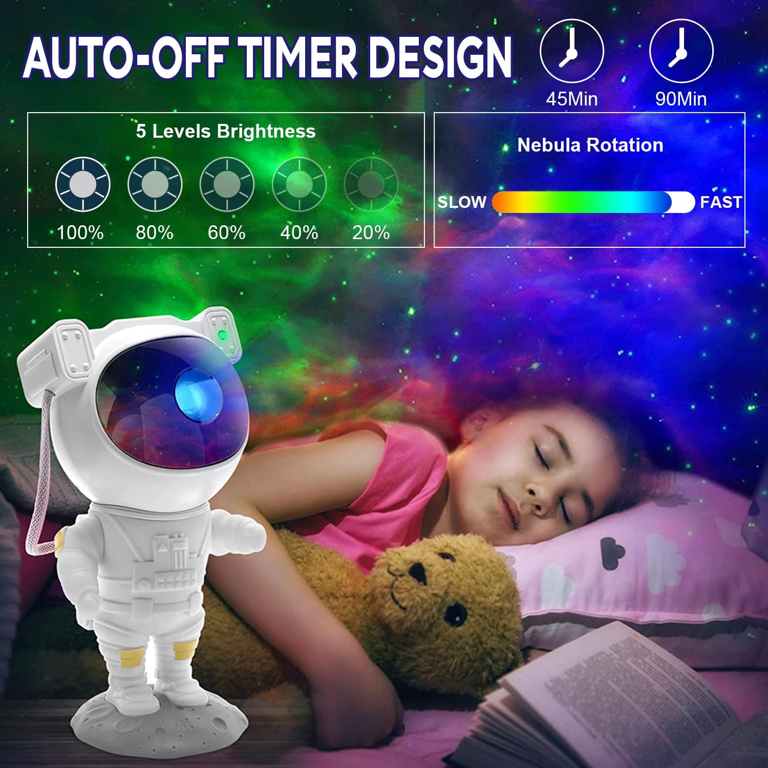 【Comes With a Remote Control】- You can control it by buttons on the astronaut itself or by remote. When using the remote (requires two AAA batteries, not included) has many settings. You can adjust the brightness, the “breathing” of the stars, the color of the nebula. It has a timer. It can be set to shut off in 45 or 90 minutes or left on continuously