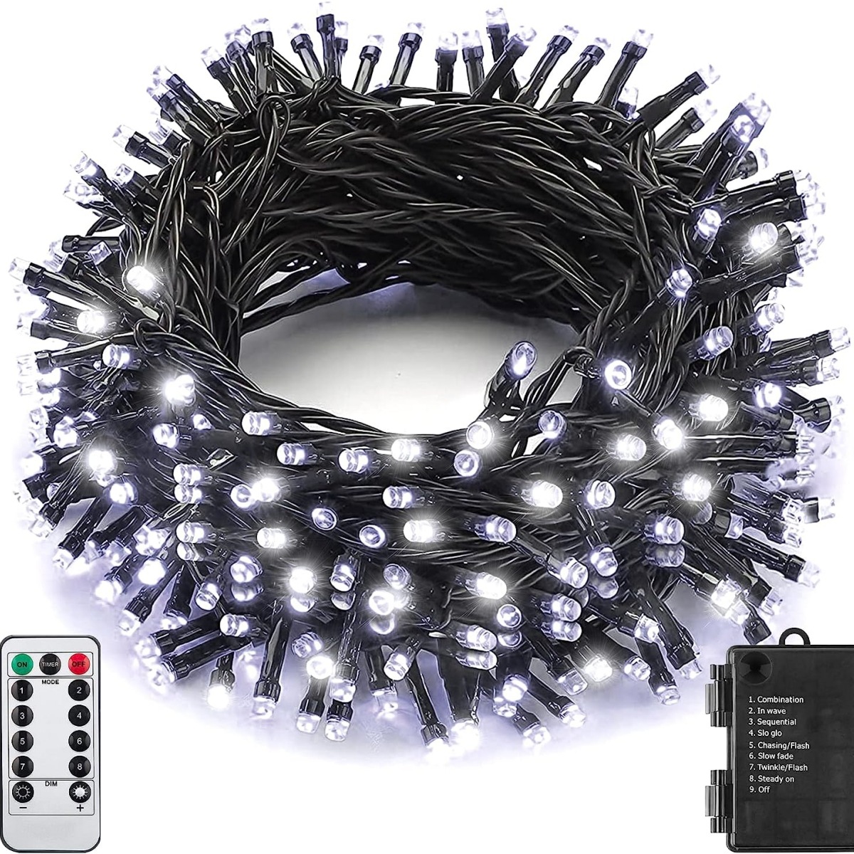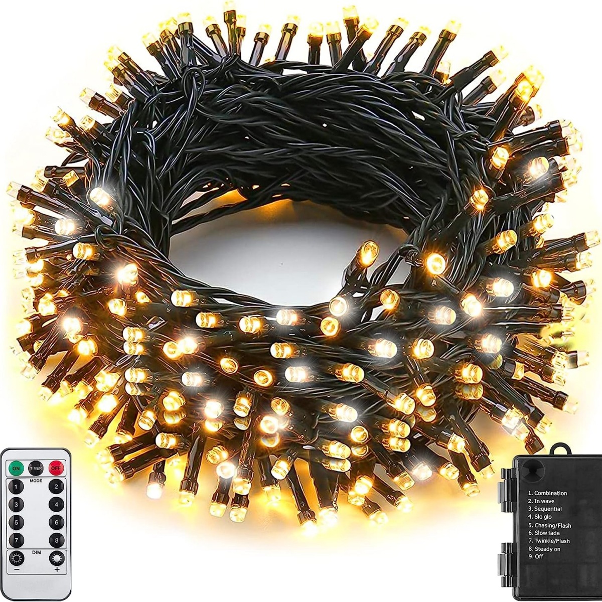 - 4 SET End To End Connectable & 8 Lighting Modes: each halloween fairy light comes with an end-to-end plug, which makes you can connect max 4 sets together. each one length is 108 feet with 300 leds, the max expandable length is 400 feet with 1200 LEDs. with 9 working modes: 2 colors combination, 2 colors steady on, 2 colors twinkle/flash, 2 colors sequential, 2 colors slow fade, 2 colors slo-glo, 2 Colors In waves, 2 colors Chasing&Flash.